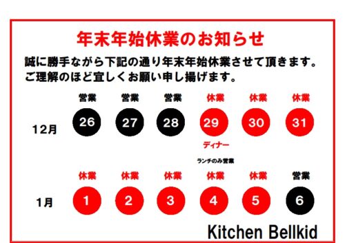 今年も早いもので、年末のご挨拶をさせていただく時期となりました。 本年もBellkidをご利用いただき、誠にありがとうございました。<m(__)m> 皆様に支えていただき、笑顔あふれる毎日を過ごすことができました。 来年も居心地のよい店を目指して頑張ってまいります。 今後とも変わらぬご愛…