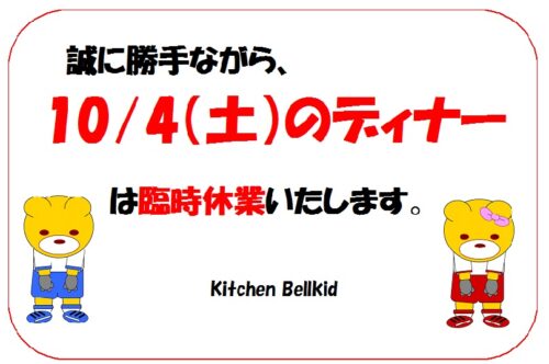 天気予報が信頼度A(予報は変わりにくいでしょう)なので多分実施されます。 今年から体育祭が平日になったそうです。 可愛い孫の体育祭にジージも行くことにしました。 ご迷惑をお掛け致しますが、何卒ご了承下さいますよう お願い申し上げます。<m(__)m> ディナーは通常通り営業…